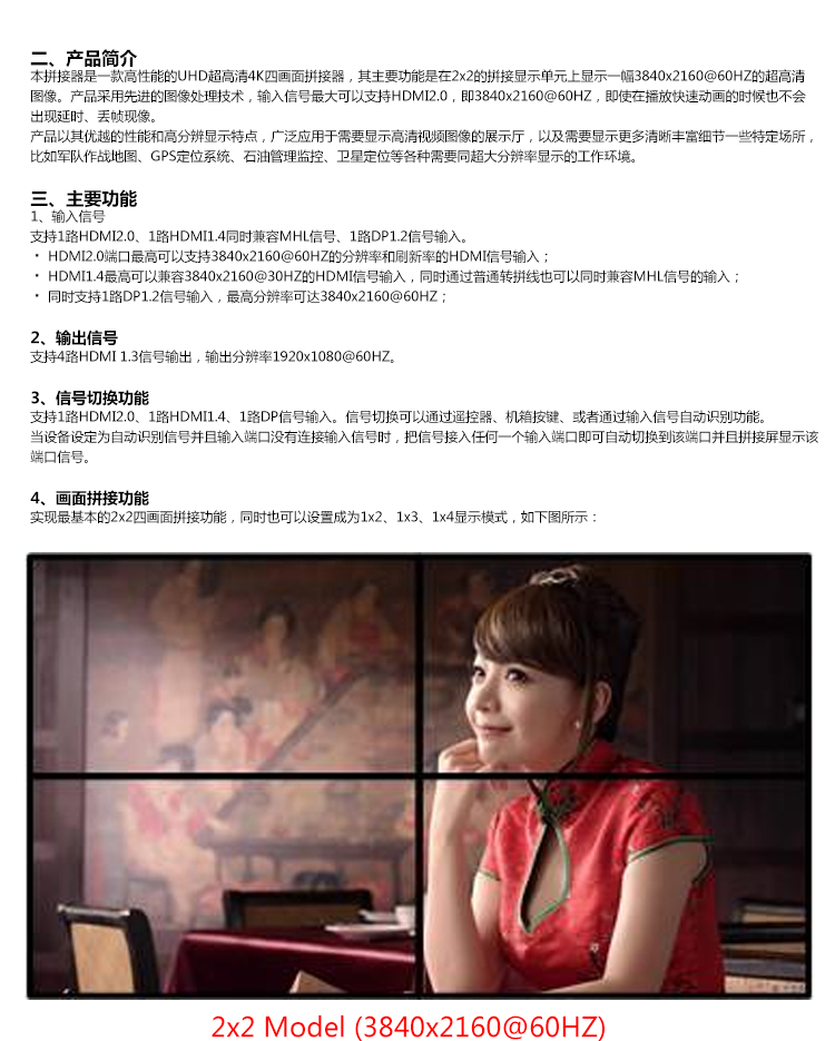 本產品是定制化的4K畫面拼接器,其主要功能是在M x N的拼接顯示單元上顯示一幅3840x2160@60HZ的超高清4K圖像。產品采用先進的圖像處理技術,輸入信號最大可以支持HDMI2.0,即3840x2160@60HZ,即使在播放快速動畫的時候也不會出現延時、丟幀現像。